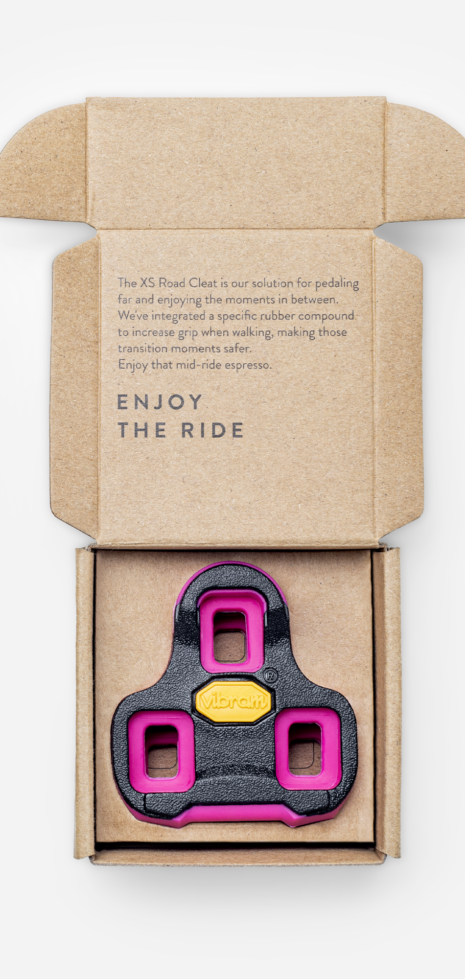 The XS Road Cleat is Vibram's solution for road cycling, designed to enhance both your ride and moments off the bike. A thin layer of rubber has been added to the contact surface of the cleat to increase grip on various surfaces, reducing the risk of slipping while walking.